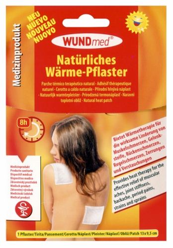 Hřejivá náplast WUNDmed přináší působením tepla účinnou úlevu od bolestí svalů, ztuhlých kloubů, bolestí zad, menstruačních bolestí, jakož i úlevu v případě natažených šlach a podvrtnutých kloubů.